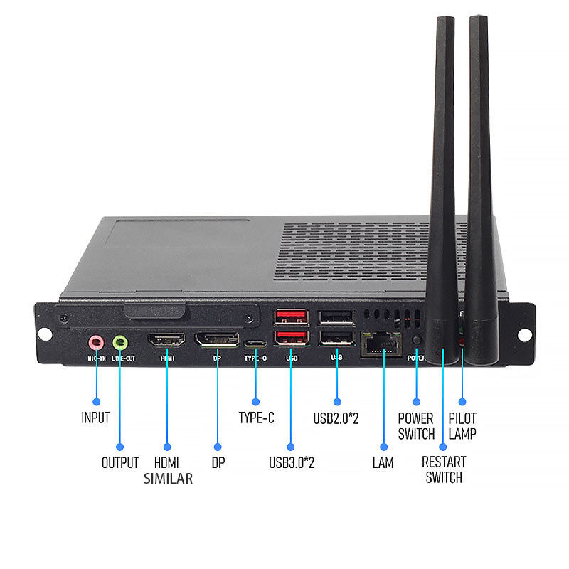 আমাদের OPS পিসি মডিউলে I/O বৈশিষ্ট্য রয়েছে: 4 X USB 3.0৪ এক্স ইউএসবি ২।0, ২ এক্স কম, ১ এক্স এলপিটি, ২ এক্স ইন্টেল আই২১০এটি গিগাবিট ইথারনেট, ১ এক্স এইচডি-এমআই, ১ এক্স ভিজিএ, এবং ১২ ভোল্ট ডিসি-ইন পাওয়ার সাপ্লাই। এটি অ্যান্ড্রয়েড ওপিএস মডিউলের জন্য নিখুঁত সমাধান,আপনাকে সহজেই আপনার ডিভাইস কাস্টমাইজ করতে দেয়.